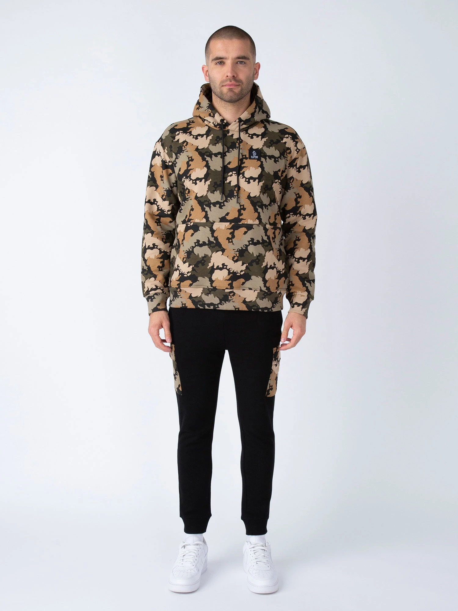 Create a bold look this season with this hoodie & joggers set from LUKE. British Goodland Camo printed hoodie is cut to a relaxed fit and constructed from a comfy cotton blend. It features a cut and sew lower front panel and two handy side pockets. Joggers are crafted from a soft cotton fleece back- they are sure to keep you feeling cosy. The side leg pockets feature the camo print, and they are fitted with a comfy drawcord waist and handy zip pockets, perfect for all your essentials. The look is then signed off with the brand’s iconic LUKE EST. 1977 woven badges.