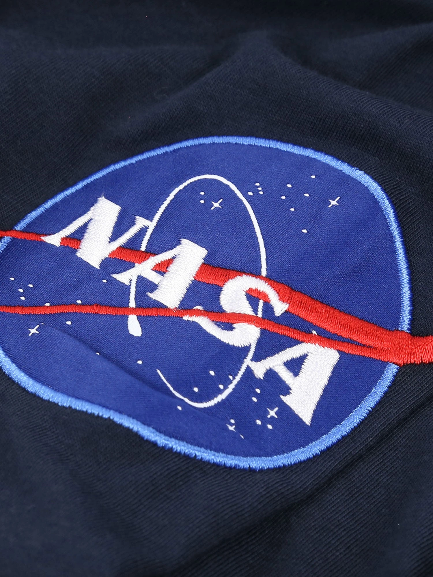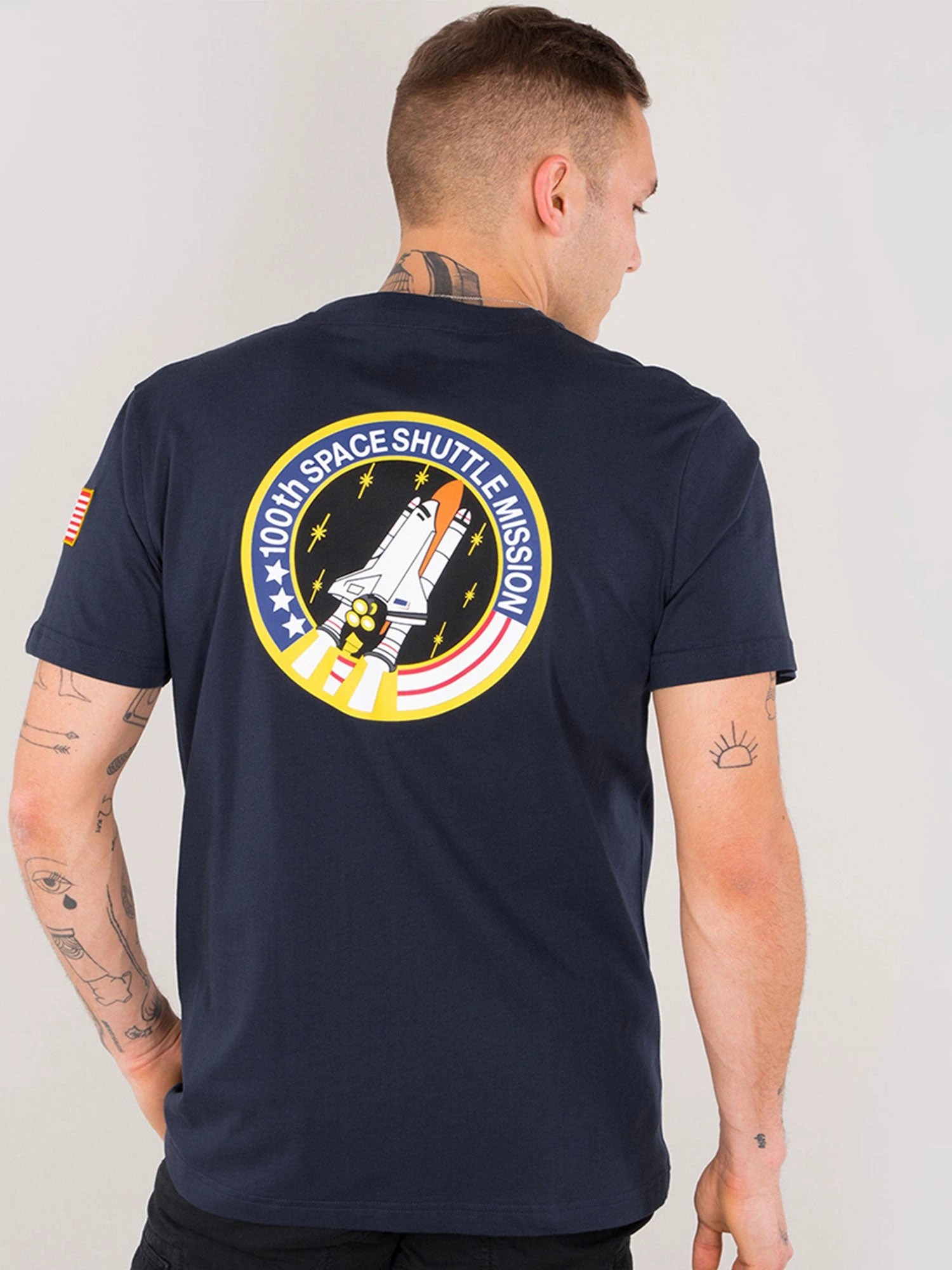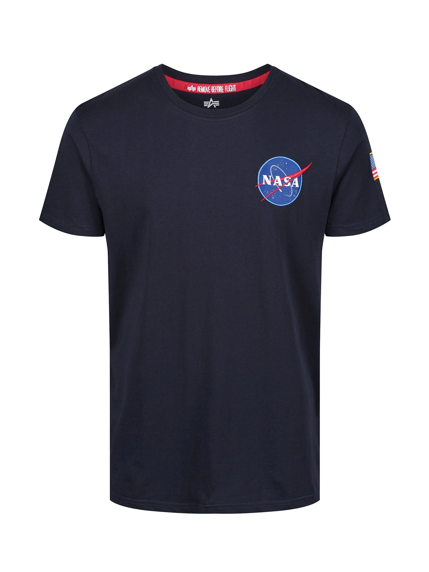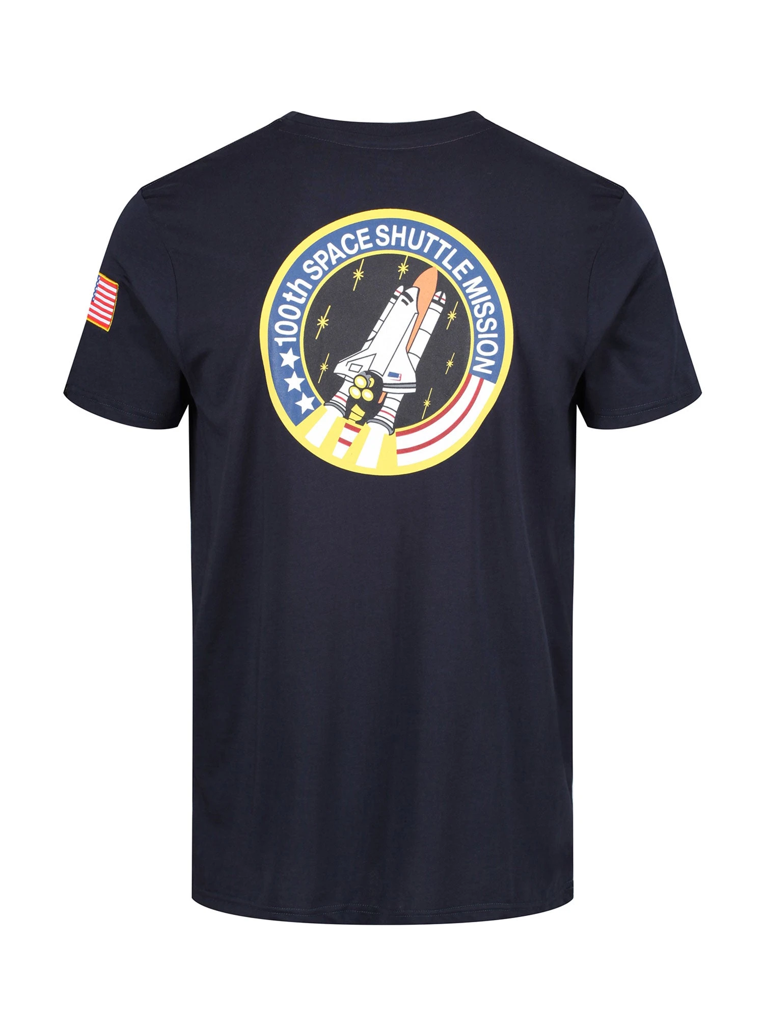 Alpha Industries Space Shuttle T. Regular fit crew neck t-shirt with embroidered NASA patches on the front and sleeve, and large NASA space shuttle print on the back.