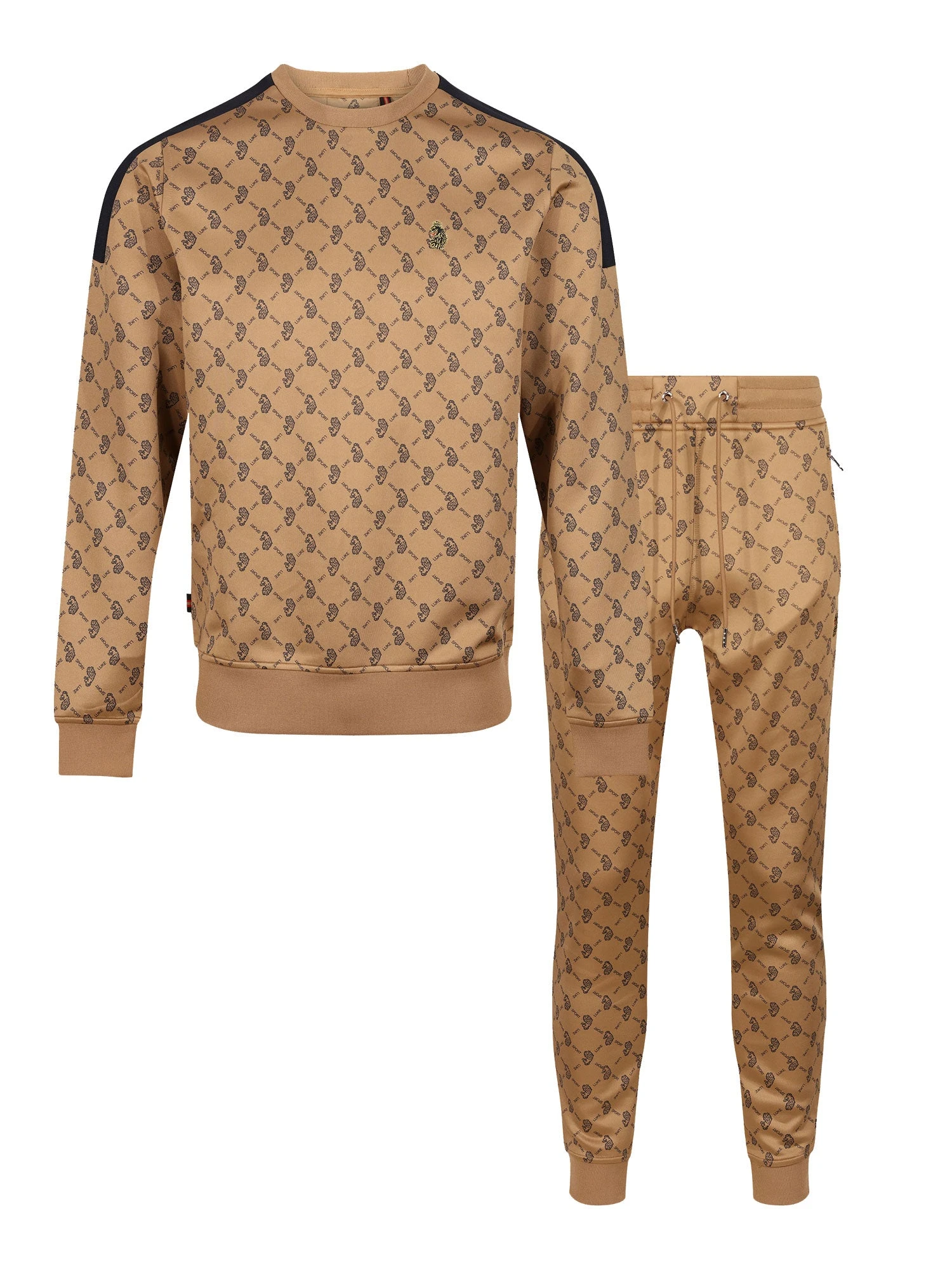 Our luxury tricot sweatshirt & joggers set from LUKE have been elevated this season with an all over LUKE SPORT repeat print. Crew neck sweatshirt features a contrast solid colour shoulder/sleeve panel and is detailed with soft rib trims throughout. Joggers are detailed with chrome metal trims. They are fitted with soft rib cuffs and a drawcord waist – perfect for comfy everyday wear. They feature essential front zip pockets. The look is then signed off with the brand’s iconic lion head embroidery on the left chest and left leg.