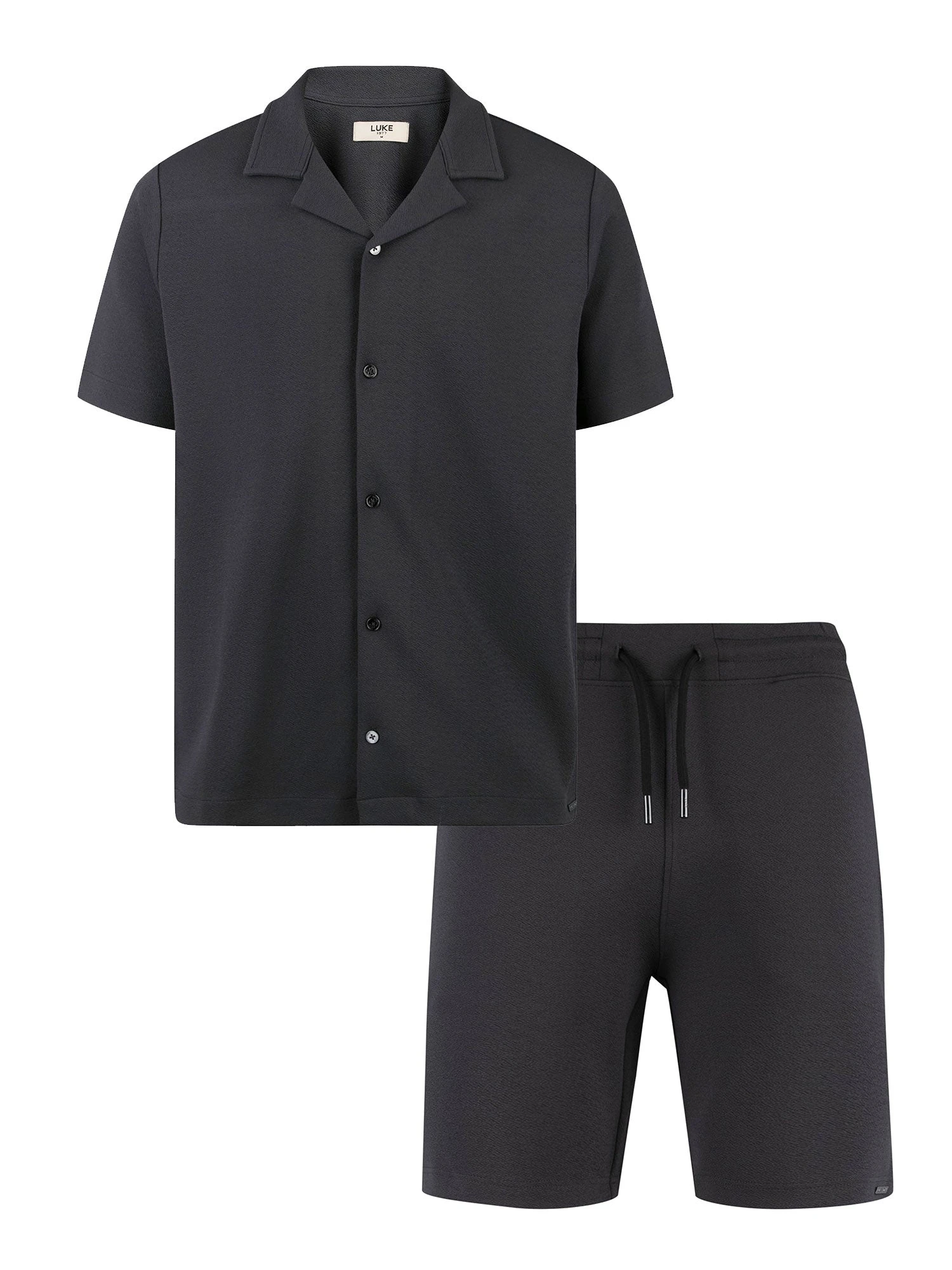 This short sleeve shirt from LUKE is the perfect summer piece. Crafted from a crinkle polyester making it a wardrobe staple. It features a Cuban collar and front summary placket. The style is then signed off with the iconic LUKE branded shiny summarys and metal rivet on the left hem.