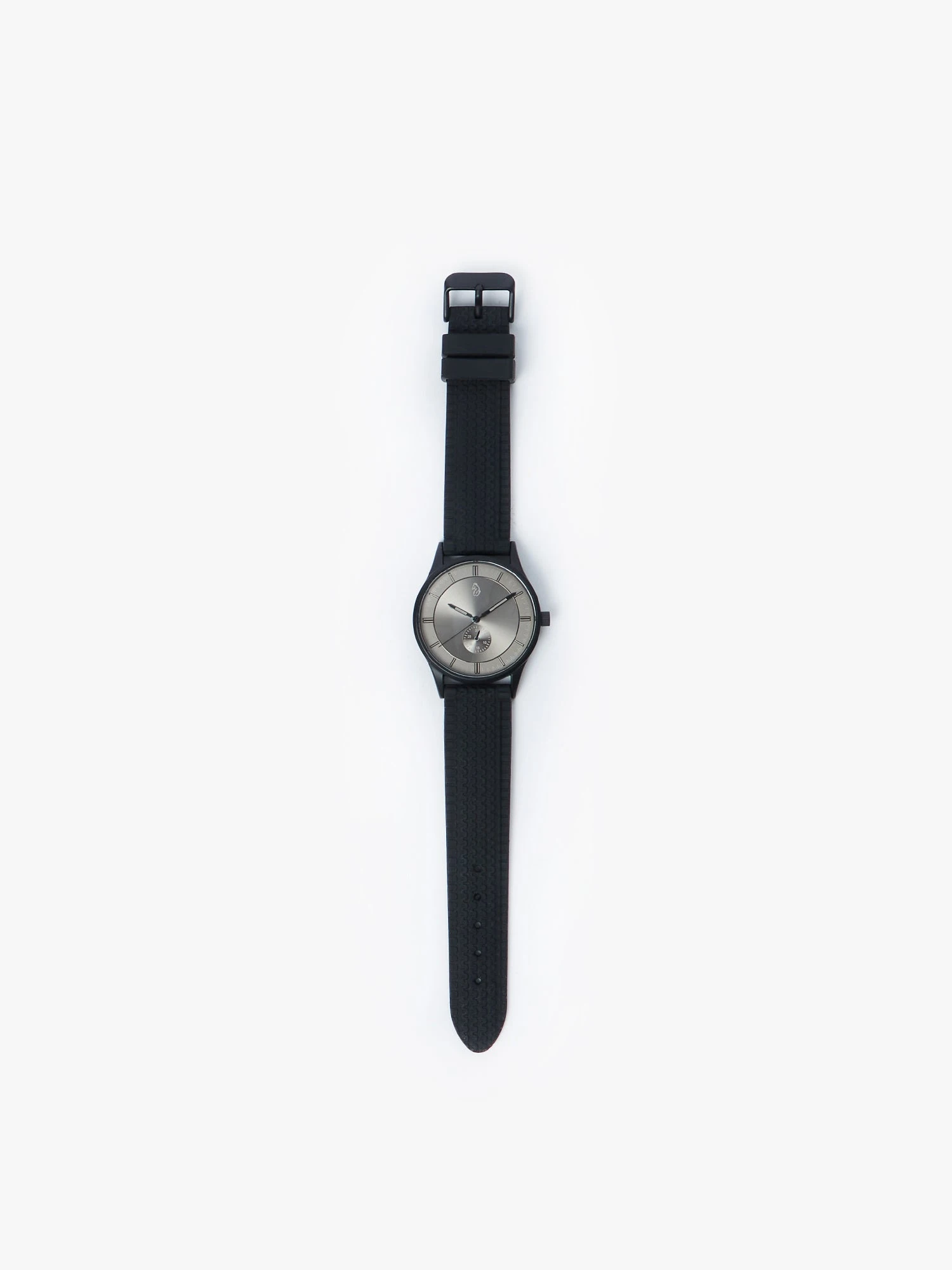 Introducing the LAAX watch from LUKE. This watch seamlessly blends styles and functionality. The matte black case and the black silicone textured strap ensure for a sophisticated look for any occasion. The timeless pewter dial is complemented with a second sub dial for dates, highlighting the perfect balance of modernity and traditional design. The piece is then signed off with the iconic LUKE lion head engraved at the top of the dial, as well as 3 hands which offer a clear and precise display of time.