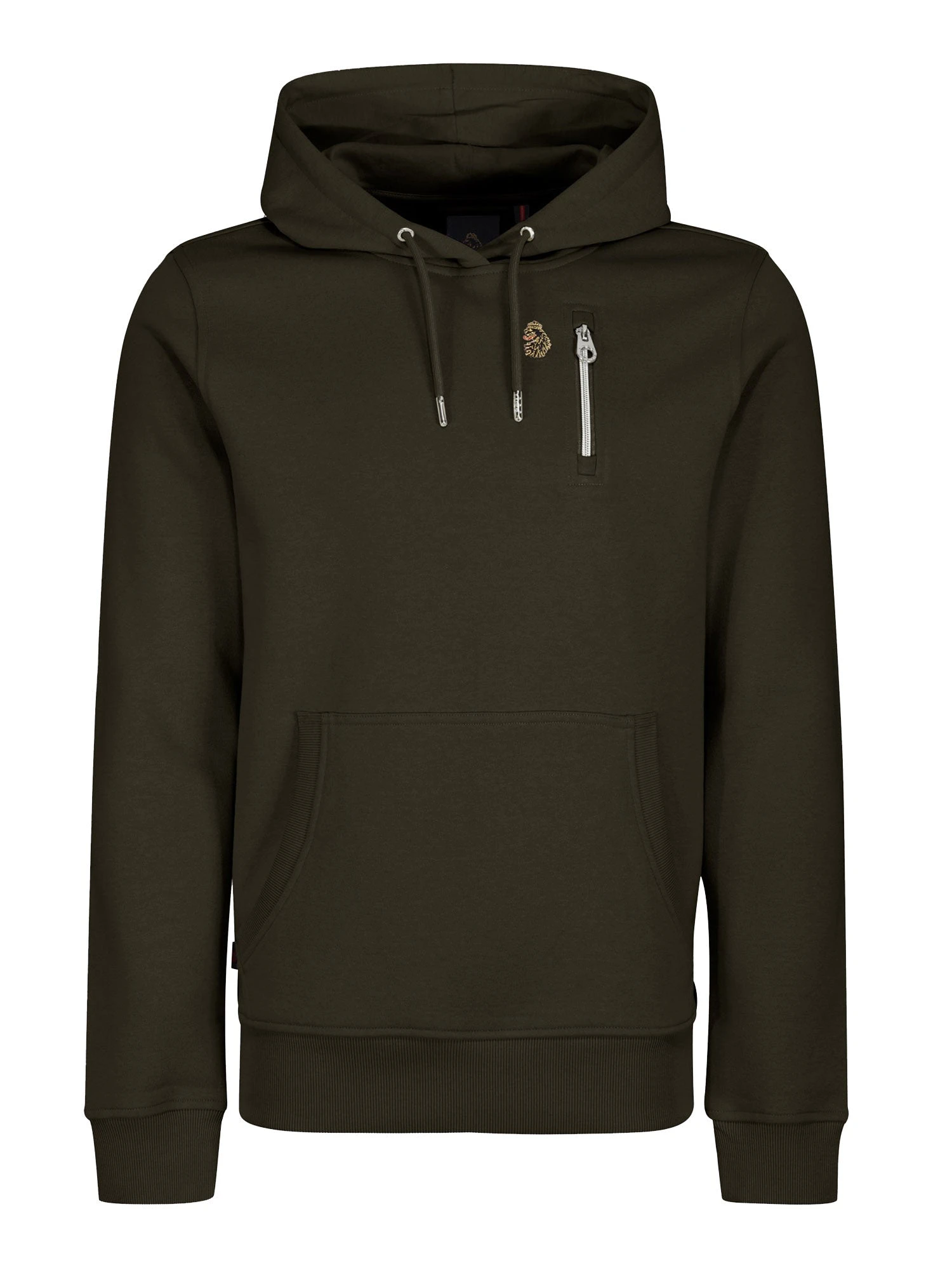 - Zip chest pocket with chrome zip puller and teeth on the hoodie