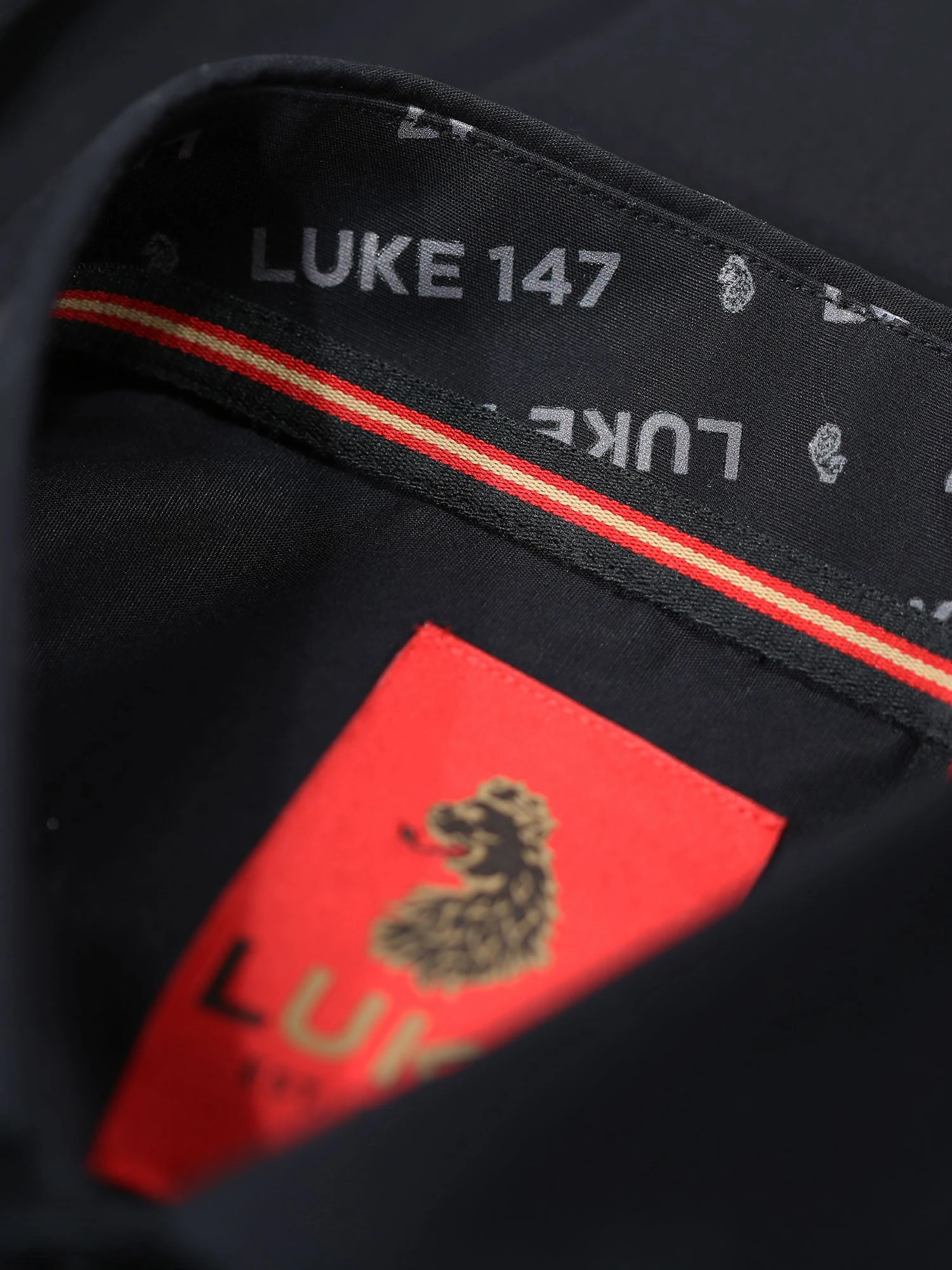 - LUKE 147 text repeat print on internal of collar and cuffs